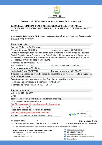 No dia 07 de janeiro a Apae de Cachoeiro firmou mais uma parceria com o Governo do Estado por meio da Secretaria de Trabalho, Assistência e Desenvolvimento Social, para execução de R$ 15.000,00 repassados por indicação dos Deputado Sérgio Meneguelli, via Emenda Parlamentar.