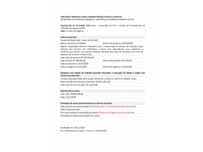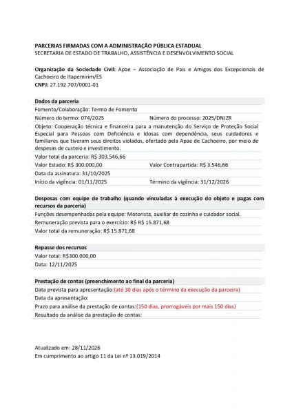 No dia 30 de outubro a Apae de Cachoeiro firmou mais uma parceria com o Governo do Estado por meio da Secretaria de Trabalho, Assistência e Desenvolvimento Social, para execução de R$ 300.000,00 repassados por indicação dos Deputados Allan Ferreira, Bruno Rezende e Theodorico Ferraço, hoje prefeito de Cachoeiro, via Emenda Parlamentar.