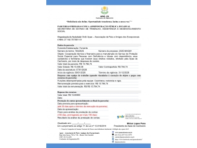 No dia 07 de janeiro a Apae de Cachoeiro firmou mais uma parceria com o Governo do Estado por meio da Secretaria de Trabalho, Assistência e Desenvolvimento Social, para execução de R$ 15.000,00 repassados por indicação dos Deputado Sérgio Meneguelli, via Emenda Parlamentar.